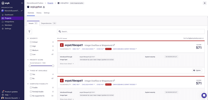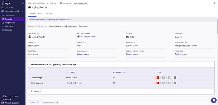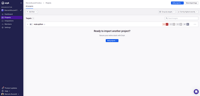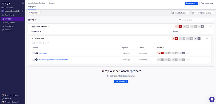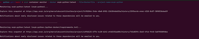 snyk container monitor --docker snyk-python:latest --file=Dockerfile --project-name=snyk-python- Esse comando irá gerar um um projeto no Snyk com o nome snyk-python.