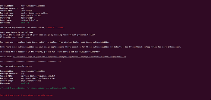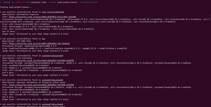 snyk container test --docker snyk-python:latest --file=DockerfileObs.: Esse comando irá gerar um relatório de falhas encontradas.